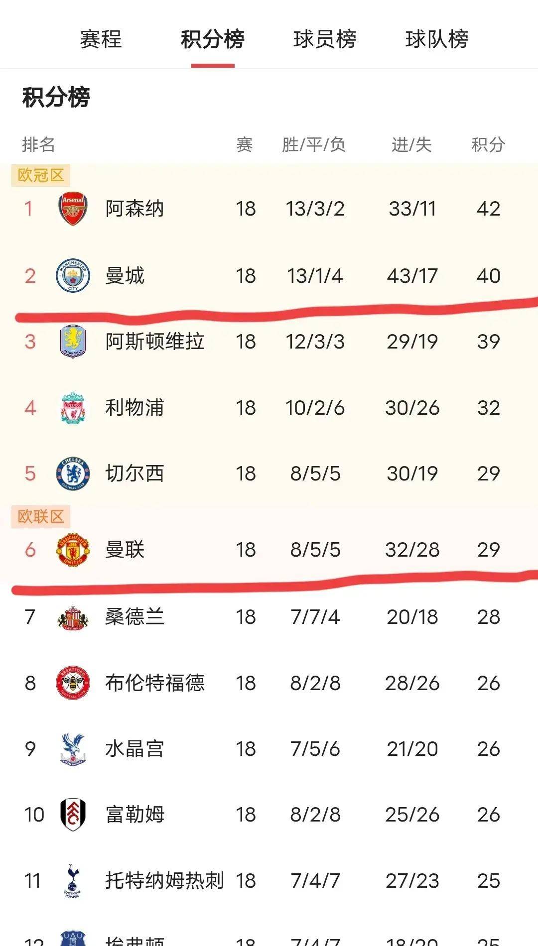 แมนเชสเตอร์ ยูไนเต็ด อยู่ในอันดับที่หก โดยทีมค่อยๆ มีเสถียรภาพมากขึ้นและยังคงมีความหวังที่จะคว้าตั๋วไปเล่นในแชมเปียนส์ลีก ทีมในหกอันดับแรกของตารางส่วนใหญ่เป็นทีมยักษ์ใหญ่ดั้งเดิม การแข่งขันระหว่างทีมระดับรองลงมา ตั้งแต่เชลซีไปจนถึงนิวคาสเซิล ยังคงดุเดือด โดยมีหลายทีมที่มีศักยภาพในการไต่อันดับขึ้นไป