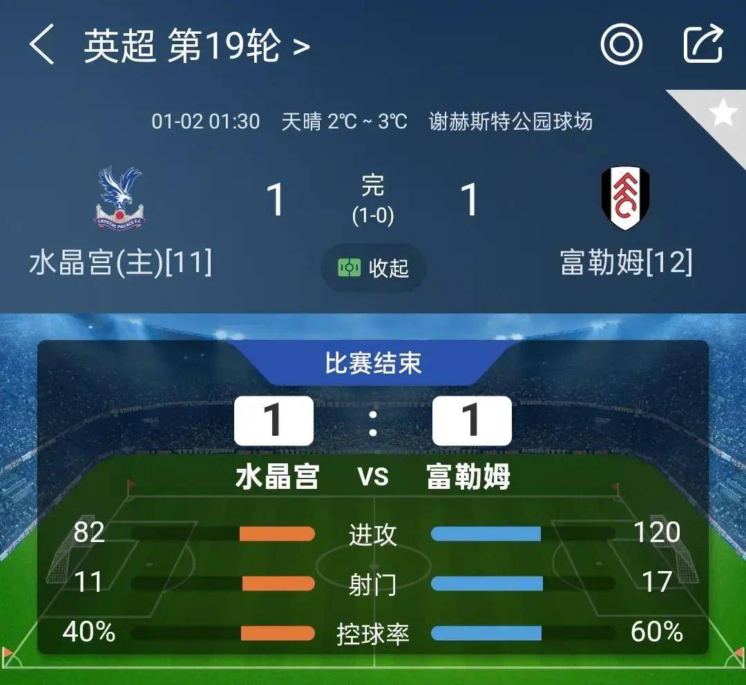 มีเพียงหนึ่งนัดเท่านั้นที่มีการทำประตูเกิดขึ้น นั่นคือการแข่งขันระหว่างคริสตัล พาเลซกับฟูแล่ม ผลเสมอ 1-1 นี้กลายเป็นไฮไลท์เดียวของค่ำคืนนี้คริสตัล พาเลซ เริ่มต้นด้วยความกระตือรือร้น โดยขึ้นนำจากลูกตั้งเตะเพื่อสร้างความคึกคักให้กับเกม อย่างไรก็ตาม สถานการณ์กลับพลิกผันหลังพักครึ่ง เมื่อฟูแล่มตีเสมอได้จากจังหวะโต้กลับ ความคาดหวังที่จะได้เห็นการต่อสู้ที่ดุเดือดยิ่งขึ้นต้องพังทลาย เมื่อทั้งสองทีมดูเหมือนจะตกลงกันว่าจะผ่อนเกมลง โดยไม่มีประตูเพิ่มเติมให้เห็นจากความพยายามของพวกเขา แม้ว่าจะเป็นเกมเดียวที่มีการทำประตูในวันนั้น แต่ภาพรวมของเกมก็ไม่ได้สร้างความตื่นเต้นให้กับผู้ชมเท่าที่ควร